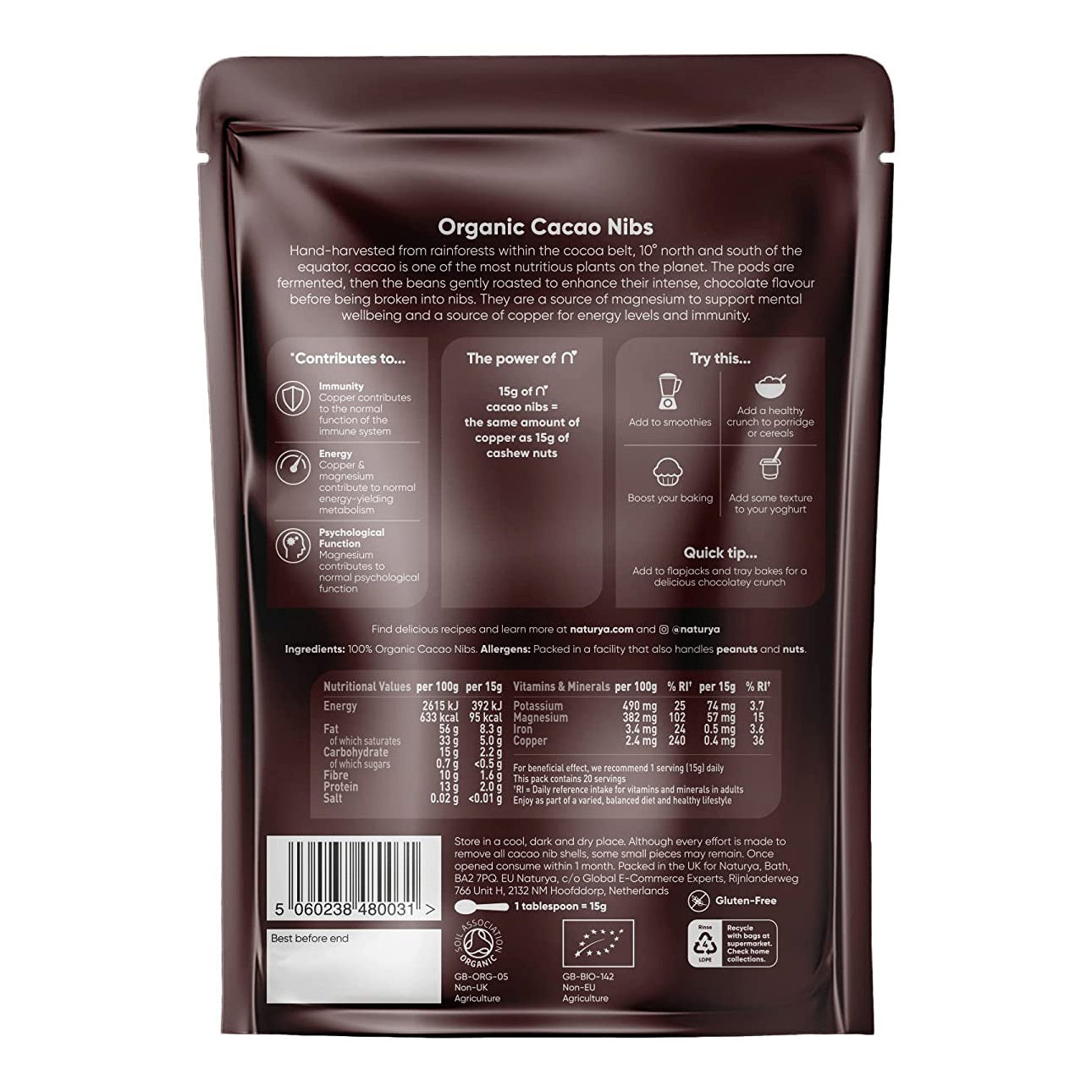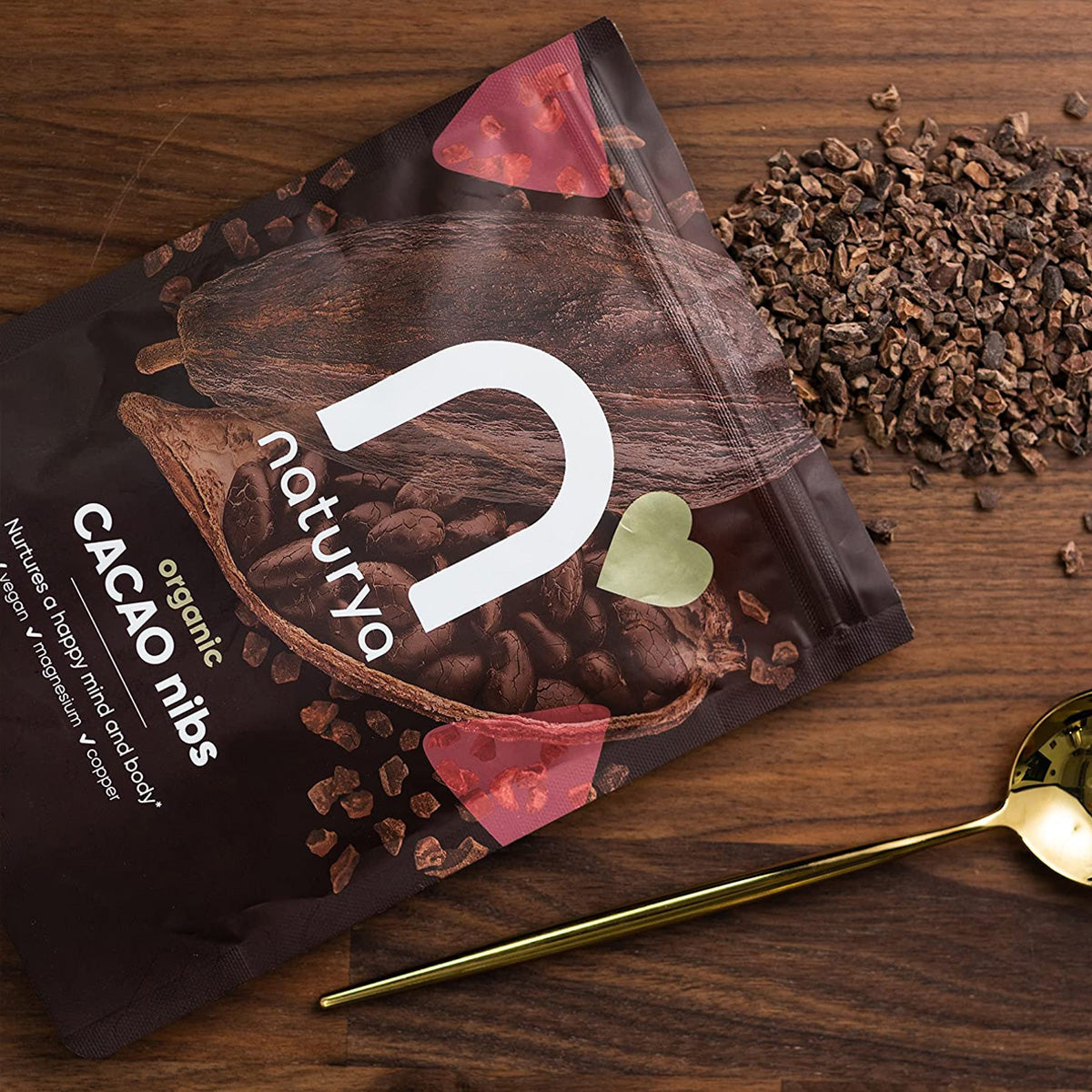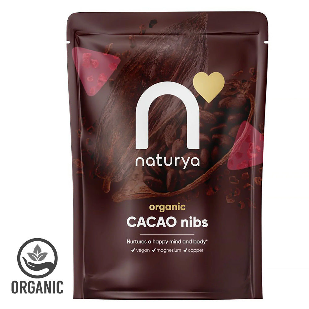 - Hand-harvested, pure roasted organic cacao nibs