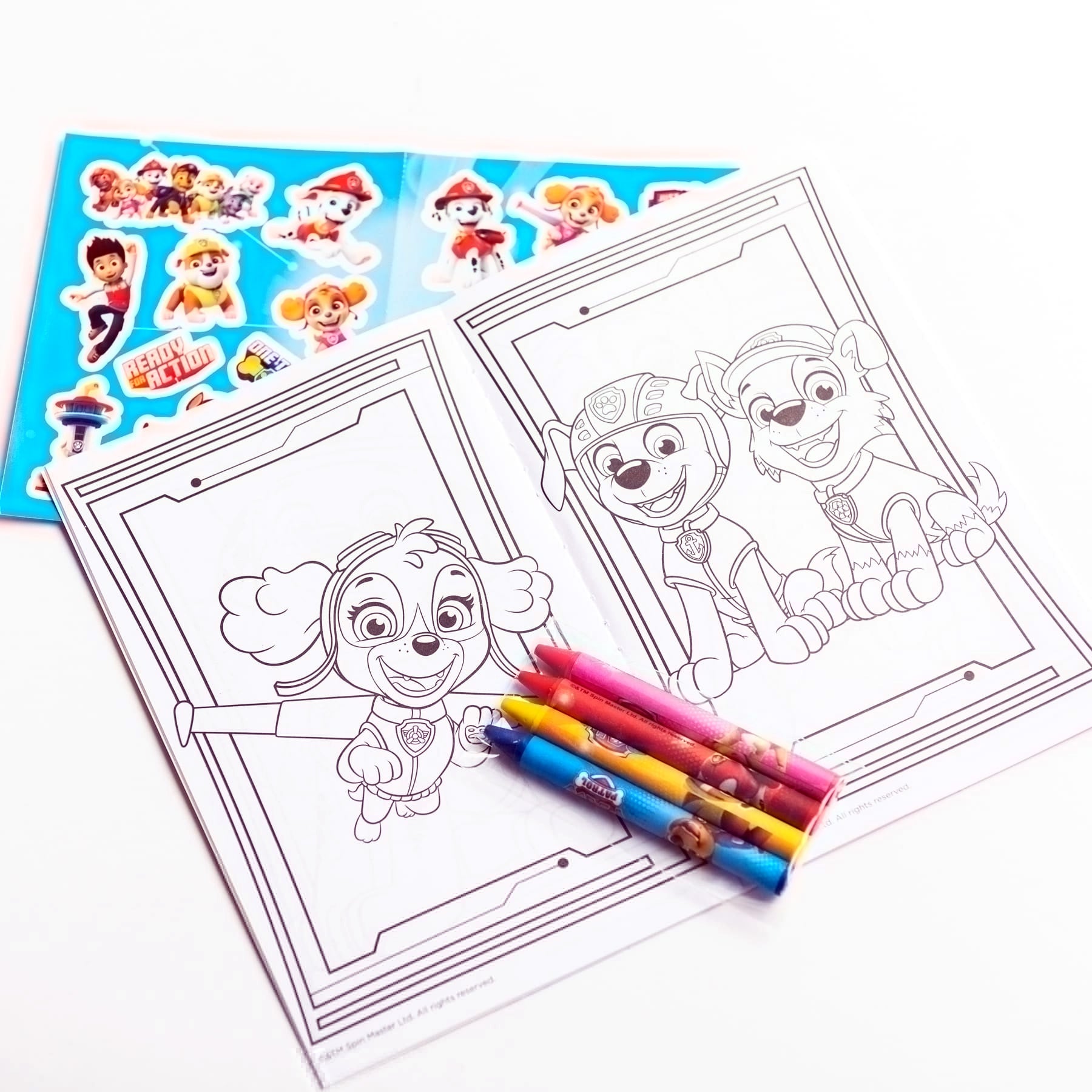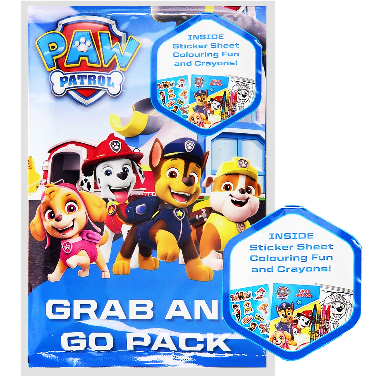 - Paw Patrol Grab and Go Activity Pack includes a colouring Book, 4 Colouring Crayons, and a reusable sticker sheet