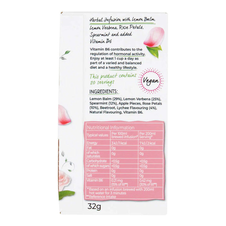 - Enjoy flavours of rose petals, lemon balm and lemon verbena with added Vitamin B6 to support the regulation of hormonal activity