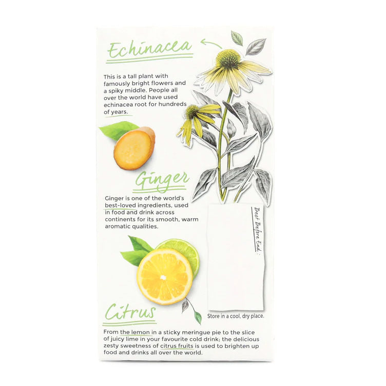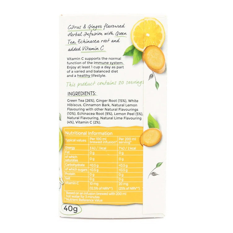 - Citrus & Ginger Flavoured Herbal Infusion with Green Tea, Echinacea Root and added Vitamin C