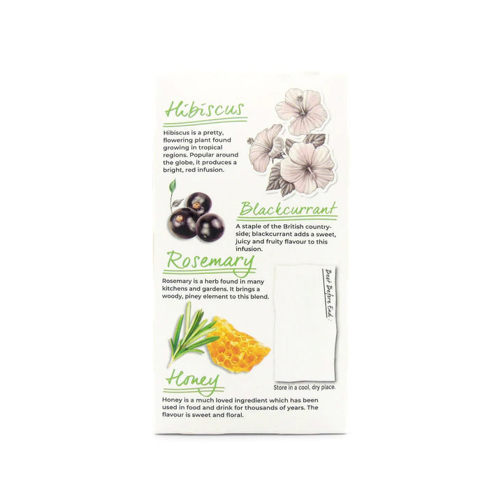 - Blackcurrant and Honey flavoured infusion with Rosemary, Hibiscus and added Thiamin
