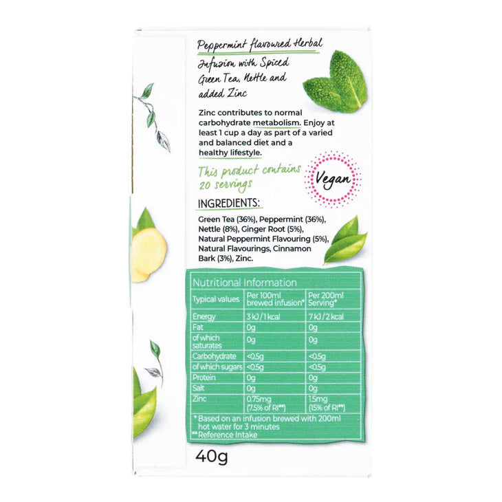 - Peppermint flavoured Herbal Infusion with Spiced Green Tea, Nettle and added Zinc