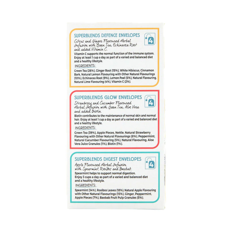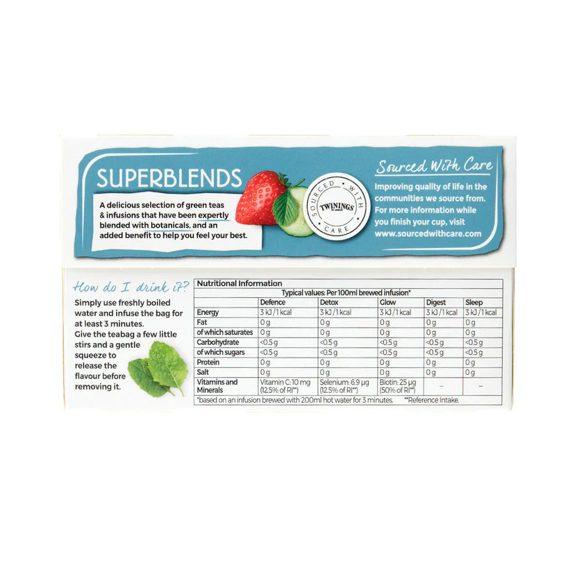 Ingredients: Green Tea (39%), Apple Pieces, Nettle, Natural Strawberry Flavouring with Other Natural Flavourings (8%), Peppermint, Natural Cucumber Flavouring (5%), Natural Flavouring, Aloe Vera Juice Granules (1%), Biotin (1%).