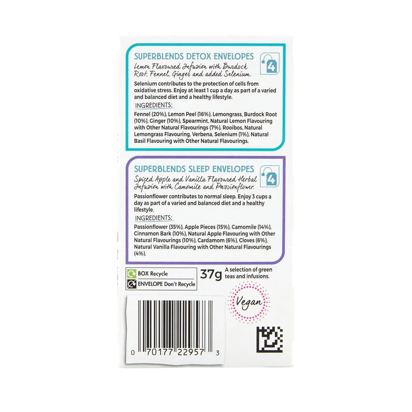 Ingredients: Fennel (20%), Lemon Peel (16%), Lemongrass, Burdock Root (10%), Ginger (10%), Spearmint, Natural Lemon Flavouring with Other Natural Flavourings (7%), Rooibos, Natural Lemongrass Flavouring, Verbena, Selenium (1%), Natural Basil Flavouring with Other Natural Flavourings.